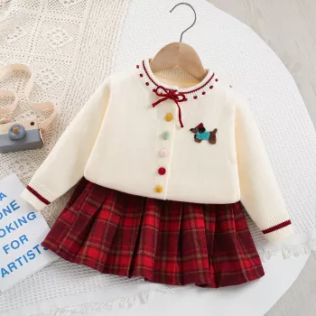 Our dress showcases a lovely ruffle-neck design and a tiered skirt that adds a playful touch. The included cardigan, accented with a flower brooch, perfectly complements the dress, creating an adorable layered look that is both warm and chic. Made with soft cotton, this outfit ensures your child stays cozy during the cool autumn and winter months, making it a must-have for their seasonal wardrobe.