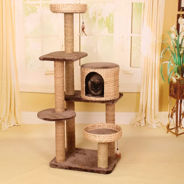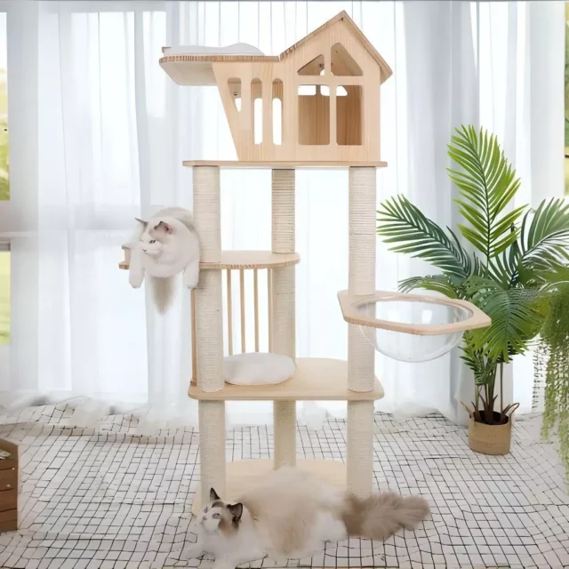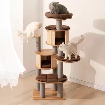 Our product stands out for its robust construction, featuring high-quality solid wood and natural sisal. These materials not only ensure durability but also cater to your cat’s instinctual needs to scratch and climb. The multi-tiered design offers ample space for exploration, while the inclusion of grinding claw-friendly surfaces and chamfers guarantees your cat’s paws and claws stay healthy and well-maintained.