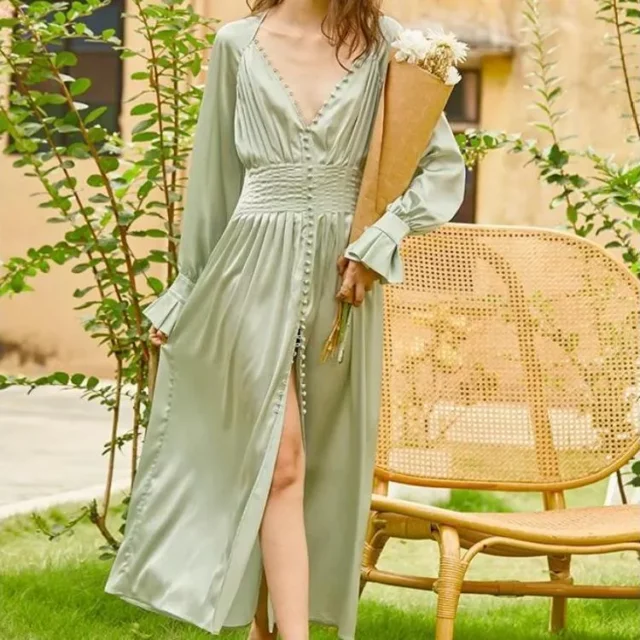 Embrace the epitome of French vintage charm with our Elegant Light Green Satin Robe Dress. Designed for the modern woman who appreciates the allure of classic elegance, this casual yet sophisticated piece is perfect for a variety of occasions. Whether you’re attending a daytime event, enjoying an evening out, or simply seeking a touch of luxury in your daily wardrobe, this dress offers unparalleled versatility and style.